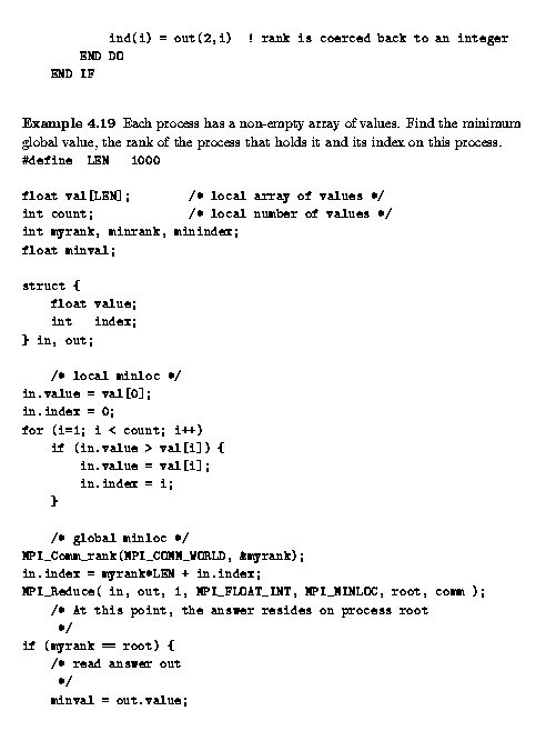 The reduce operation is defined to operate on arguments that consist of a pair: value and index. In order to use MPI_MINLOC and MPI_MAXLOC in a MPI_MINLOC MPI_MAXLOC reduce operation, one must provide a datatype argument that represents a pair (value and index). MPI provides nine such predefined datatypes. In C, the index is an int and the value can be a short or long int, a float, or a double. The potentially mixed-type nature of such arguments is a problem in Fortran. The problem is circumvented, for Fortran, by having the MPI-provided type consist of a pair of the same type as value, and coercing the index to this type also.
