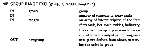 MPI_Group_range_excl(MPI_Group group, int n, int ranges[][3], MPI_Group *newgroup)