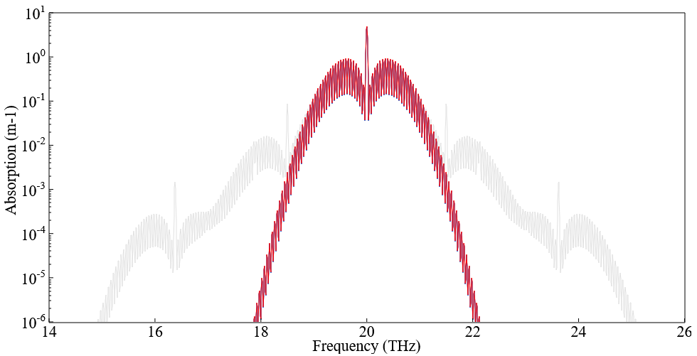 It is interesting to understand how quantum mechanics explains this unique absorption spectrum of CO2. First, as any molecule in the gas phase, CO2 rotates at different well-defined quantized frequencies. When a photon is absorbed, the molecule angular momentum can change by \(\pm\hbar\), the angular momentum carried by the photon. The resulting change in rotational kinetic energy means that the photon frequency can be slightly detuned from \(\omega_1\). This explains the series of narrow lines on both sides of the vibration frequency, the parabolic shape resulting from the Boltzmann factor governing the population of the different rotational levels (as you can check by changing the temperature in the applet). Second, CO2 has the remarkable property that the second harmonic of the bending mode frequency (20.0 THz) is almost exactly resonant with the symmetric stretching mode (40.1 THz). This property, first identified in CO2 by Enrico Fermi in 1931 [4], is known as a Fermi resonance. The mixing between the bending and stretching mode that results from this resonance splits the degeneracy and gives rise to a series of satellite absorption lines shifted away from the main absorption peak. This combination of rotational lines and Fermi resonance results in the triangular shape shown in Fig. 1, and a more than twofold increase in radiative forcing due to the Fermi resonance alone [5]. Using the applet, you can check how moving away from the Fermi resonance reduces the mixing and results in a less efficient absorption spectrum. A full understanding of the climatic impact of CO2 additionally requires the use radiative transfer models of the atmosphere [6-9].