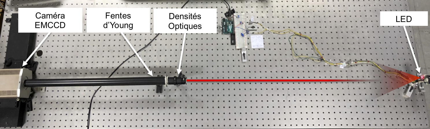 Ce laboratoire en ligne permet de contrôler l'expérience représentée ci-dessous, consistant à détecter à l'aide d'une caméra EMCCD les impacts individuels de photons en aval d'une paire de fentes d'Young. Le bouton "Run" permet de déclencher l'accumulation des impacts successifs. Vous pouvez comparer le résultat obtenu en l'absence d'éclairement ou en utilisant une diode électroluminescente (LED) rouge, verte ou bleue. L'apparition progressive des franges d'interférence illustre la nature à la fois ondulatoire et corpusculaire de la lumière. Il est toutefois important de noter que la source n'est pas une source de photons uniques mais simplement une LED fortement atténuée. On pourra consulter V. Jacques et al., Eur. Phys. J. D 35, 561–565 (2005) pour une expérience de construction des franges d'Young effectuée avec une véritable source de photons uniques.